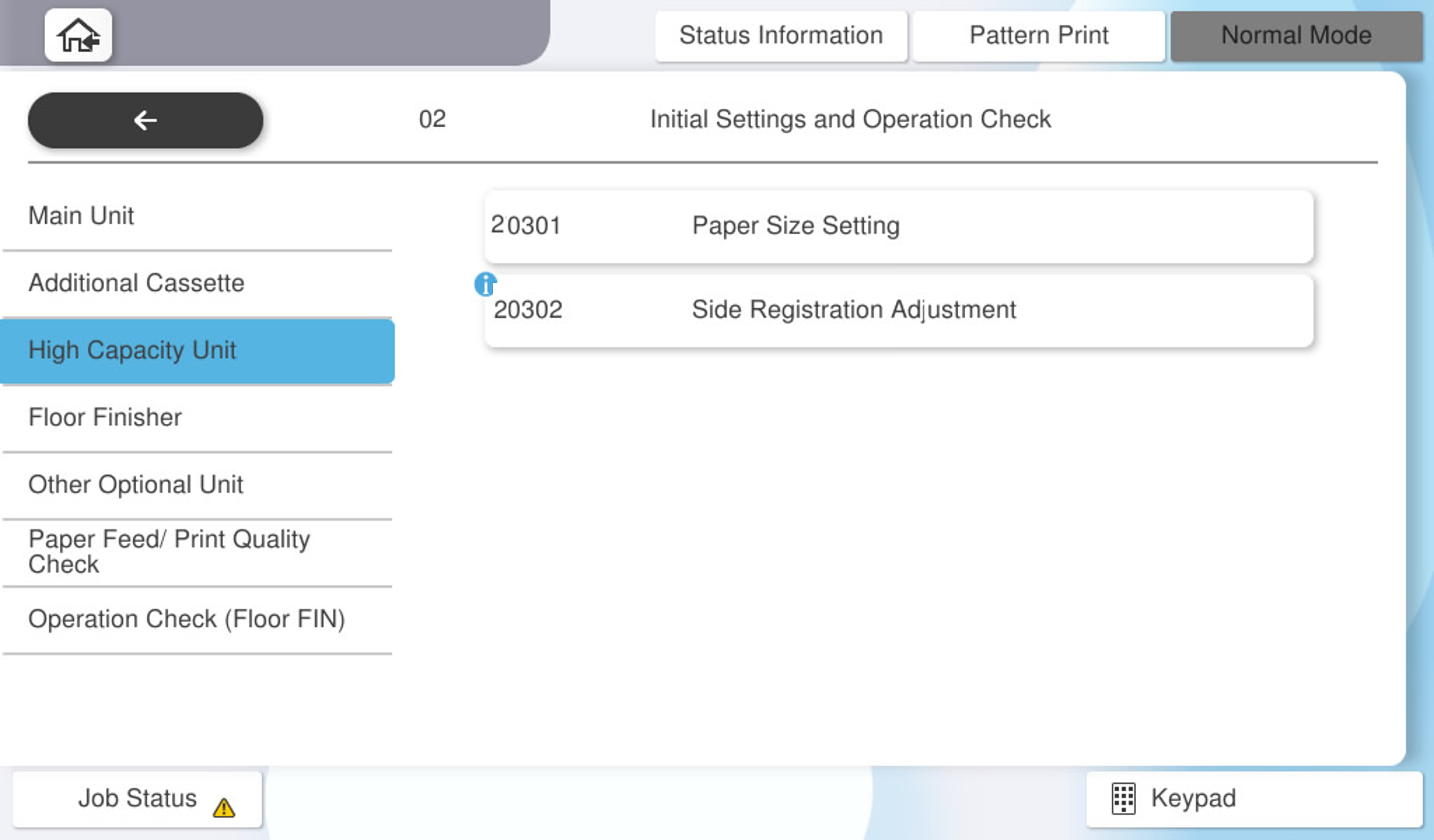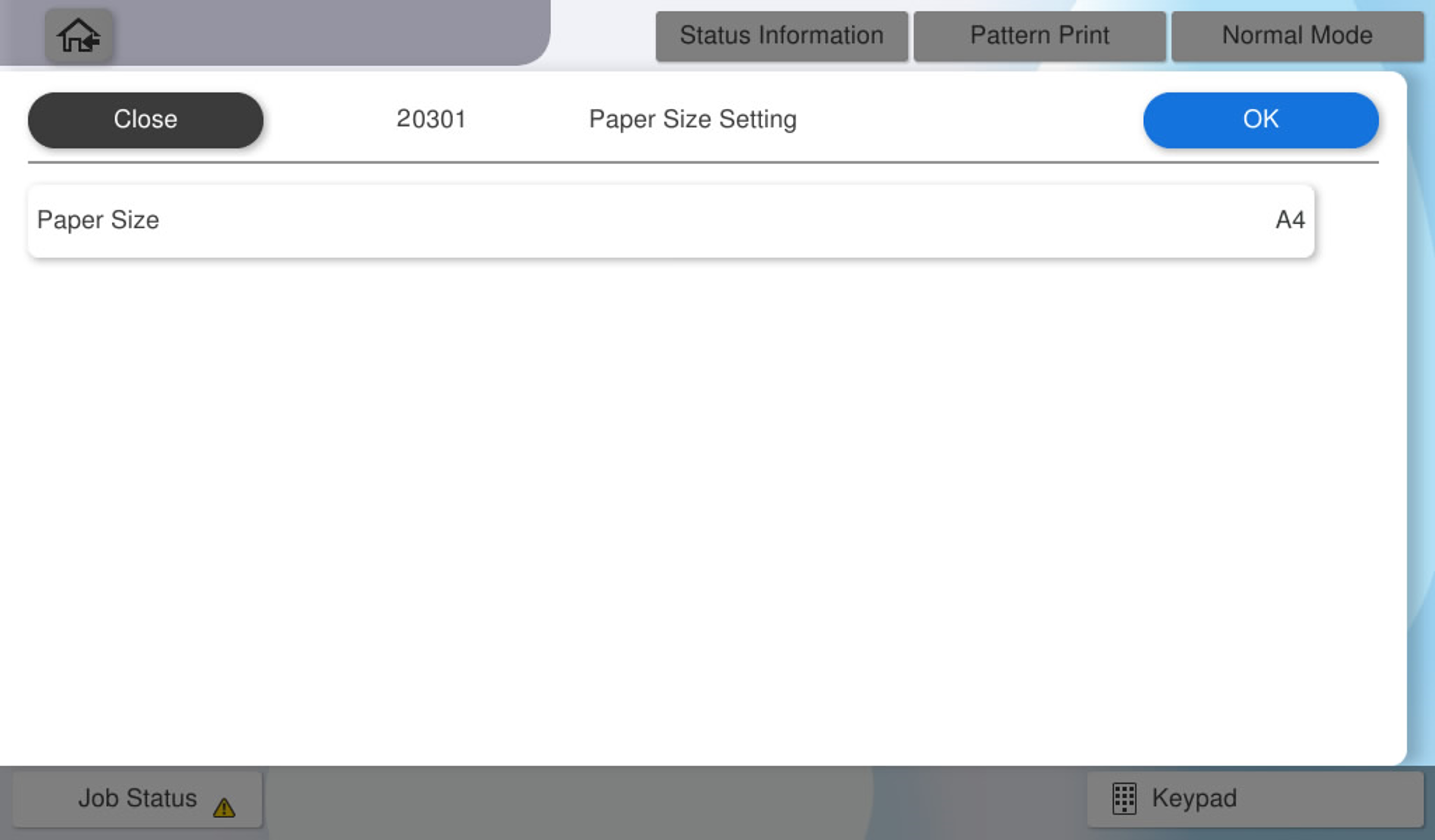 - Select [20301 Paper Size Setting], switch to the desired paper size (A4, Letter or B5) from [Paper Size Settings], and press [OK].