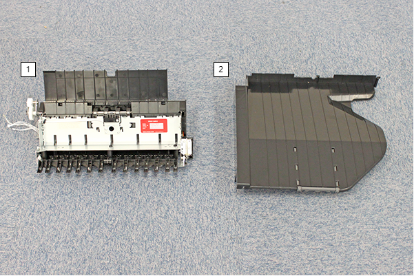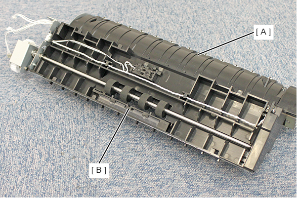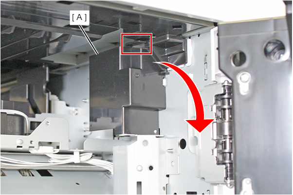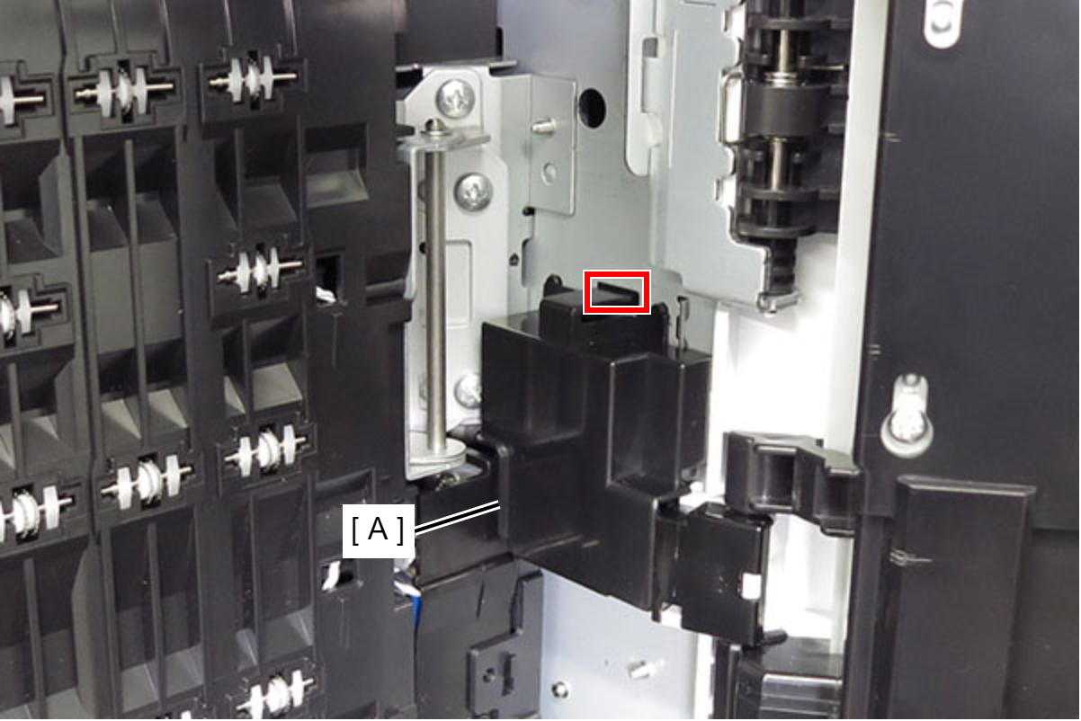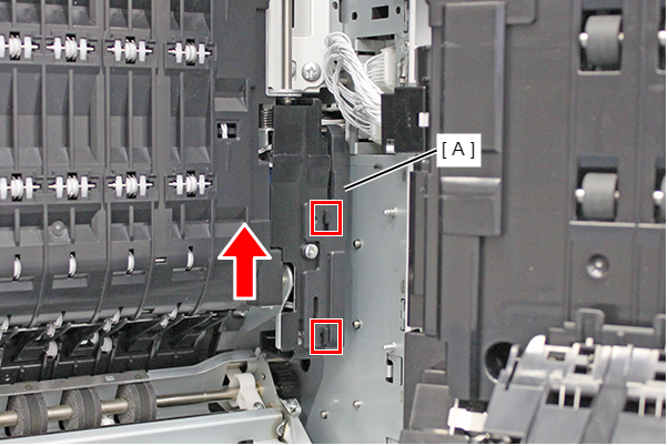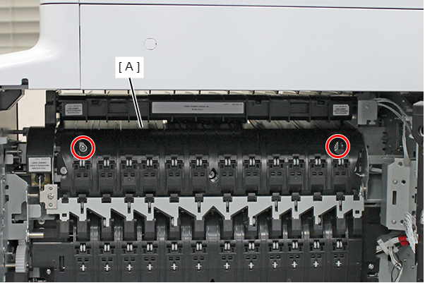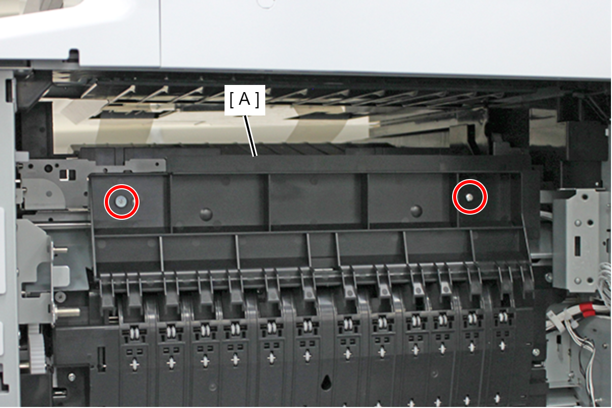 13. Remove the 2 screws and remove the pre-ejection paper guide (A).