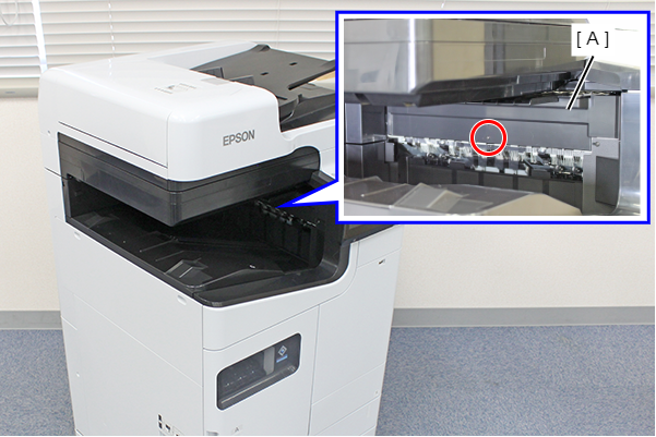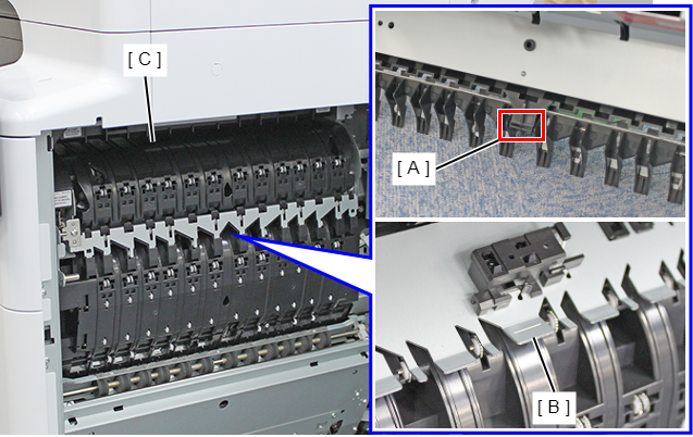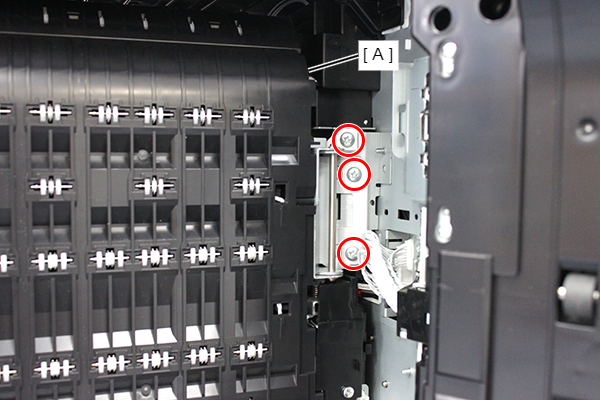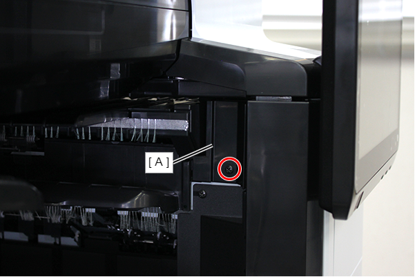 16. Check that the frame of floor bridge unit B protrudes from the 3 holes (A) on the paper output side, and tighten the 3 screws.