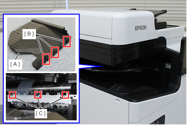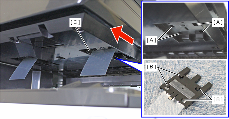 26. Hook the 3 hooks (B) of the Inner tray (A) to the 3 notches (C) of the frame, and attach the Inner tray.
