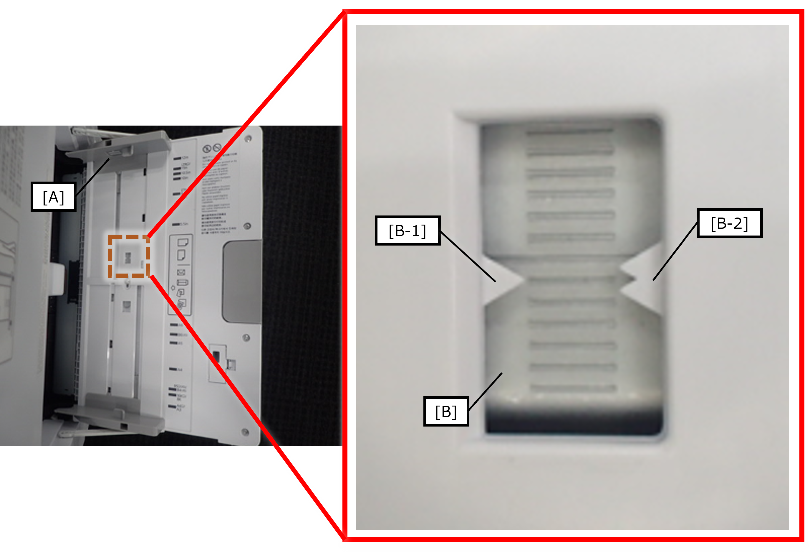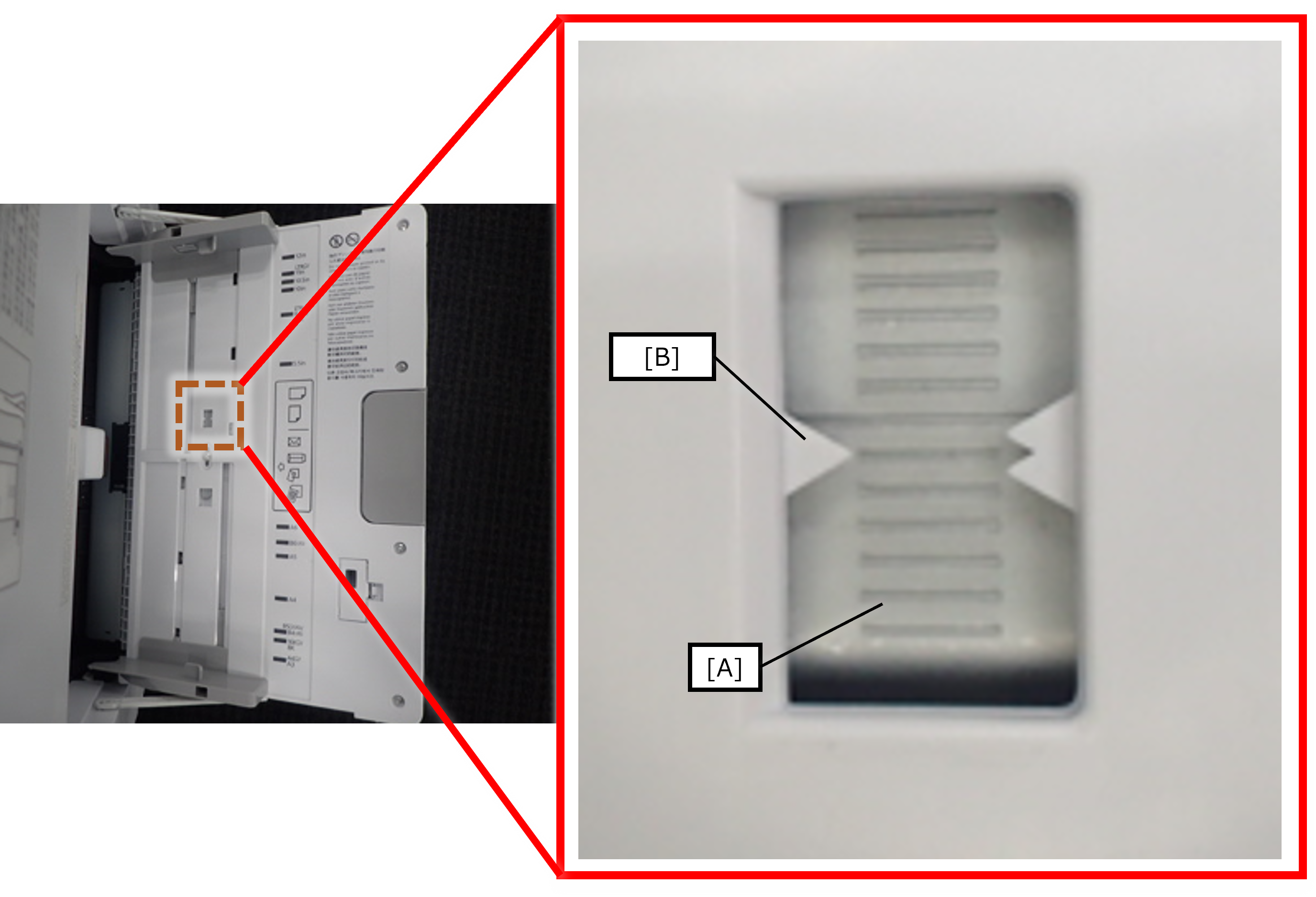 Based on the margin difference calculated from the adjustment pattern, operate the paper guide (A) on the rear side to change the position of the adjustment plate (B).