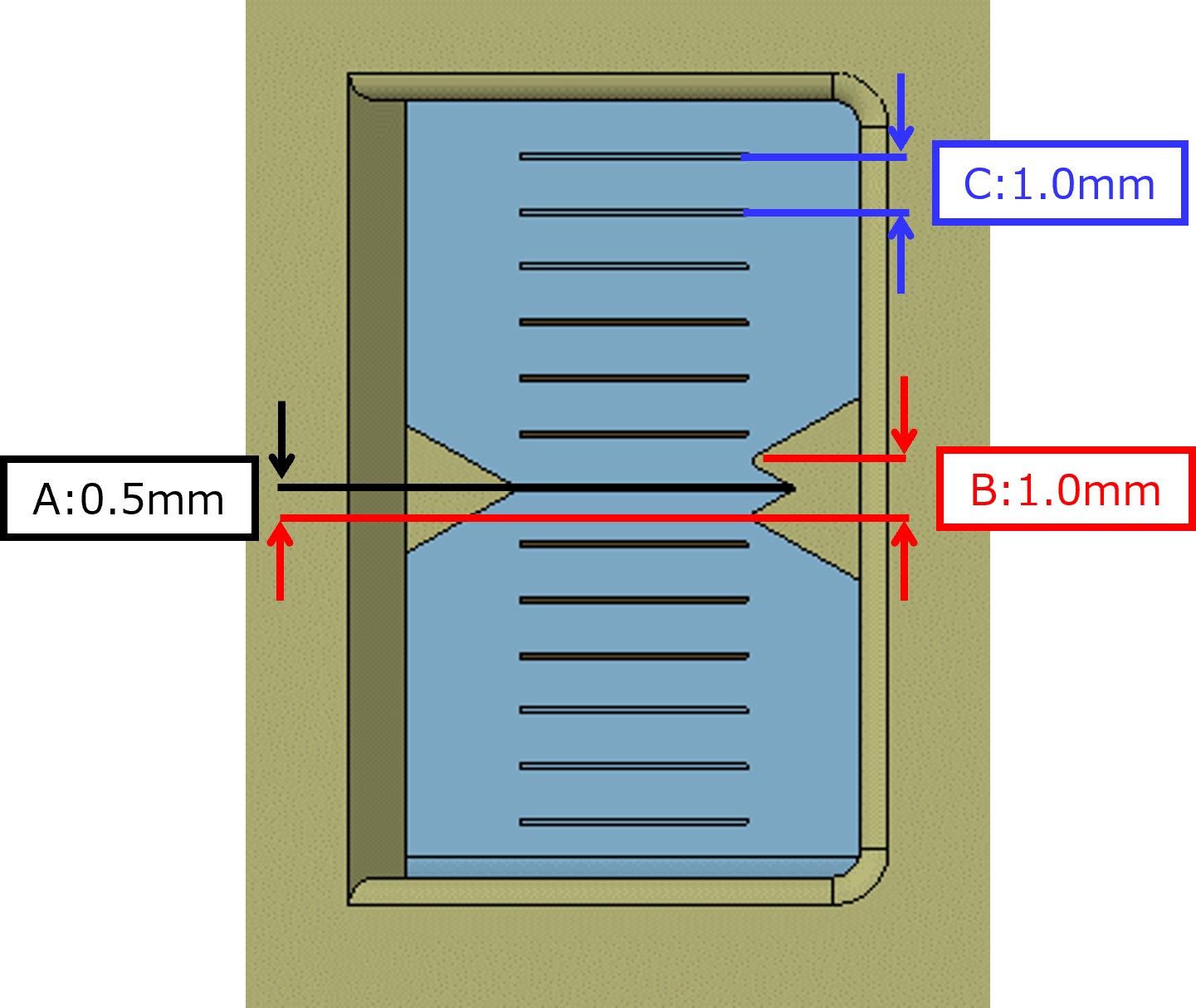 Note / 補足Amount of deviation between main guide tip and sub-guide tip (A): 0.5 mm, sub-guide tip width (B): 1.0 mm, distance between marking scales (C): 1.0 mm