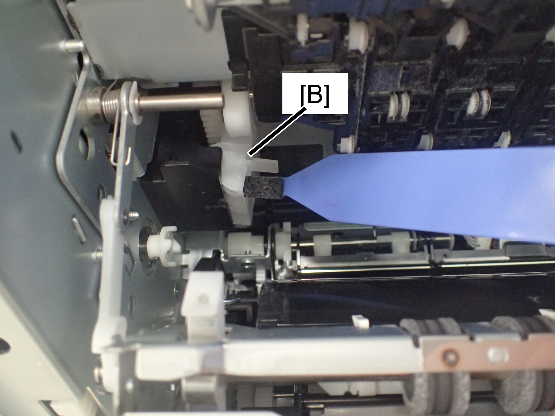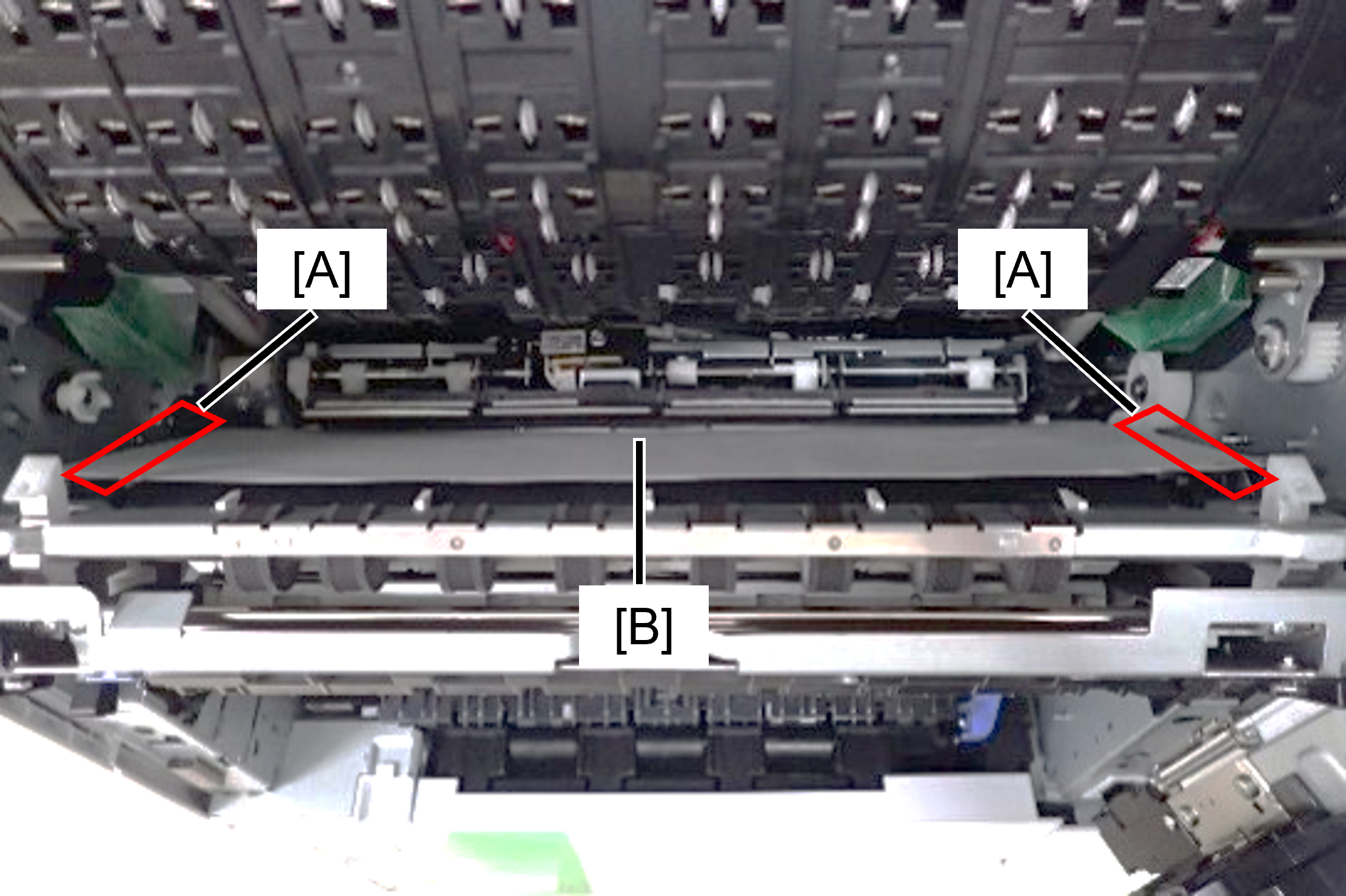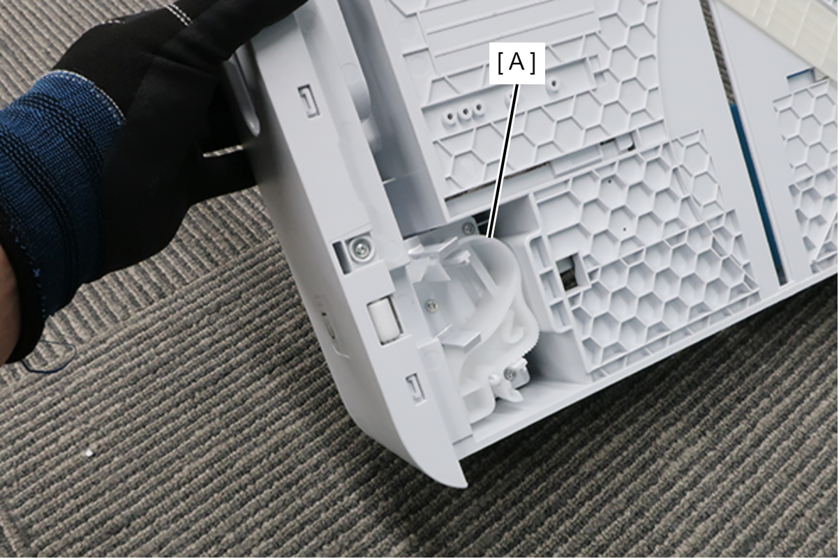 1. Remove the cap transport parts (B) attached to the right door unit (A).