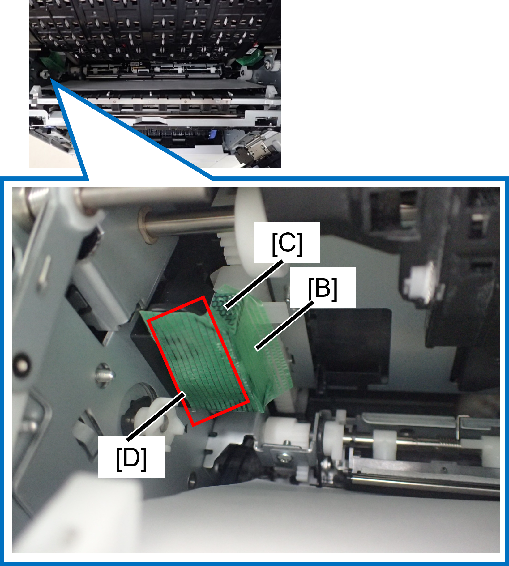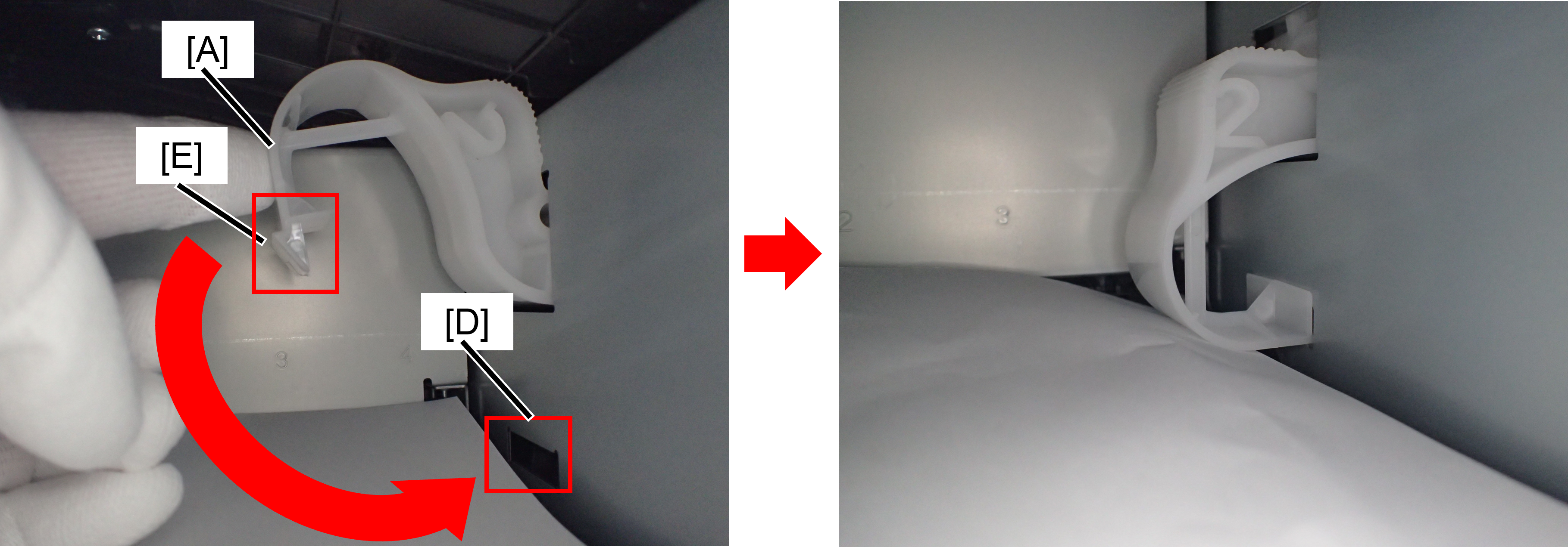 4. Rotate the head transport parts2 and attach the hook (E) into the groove (D).