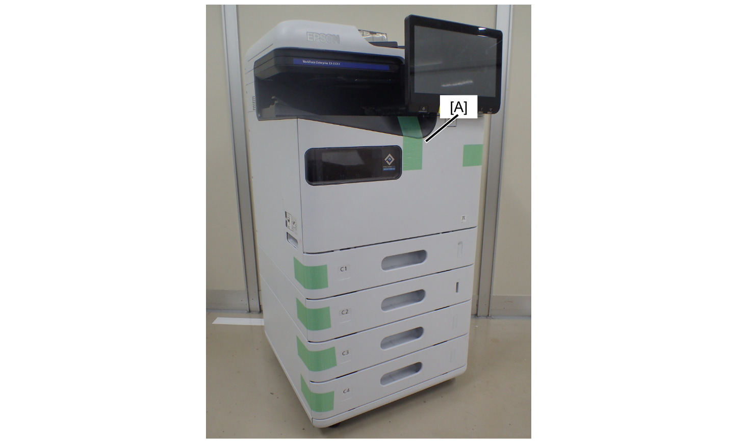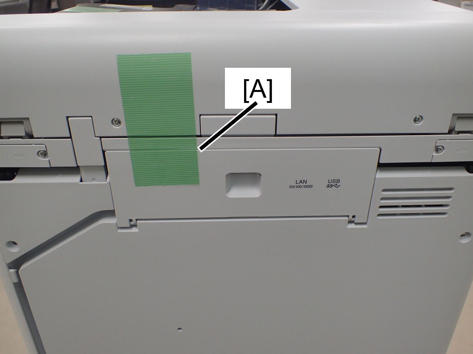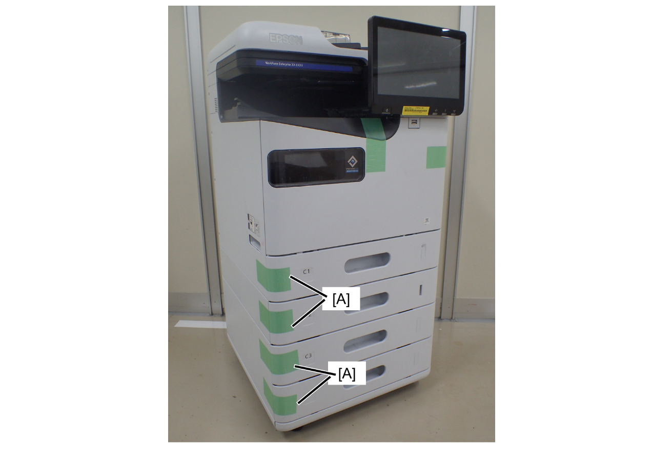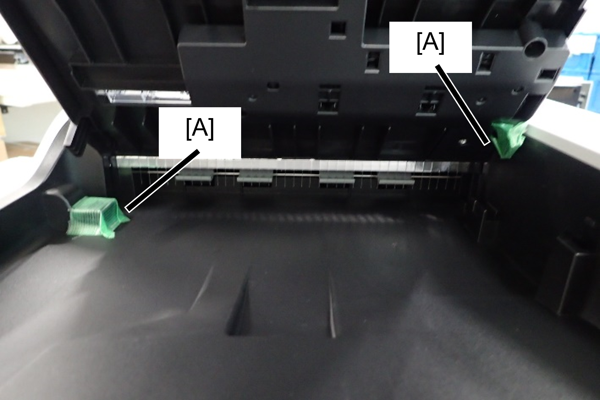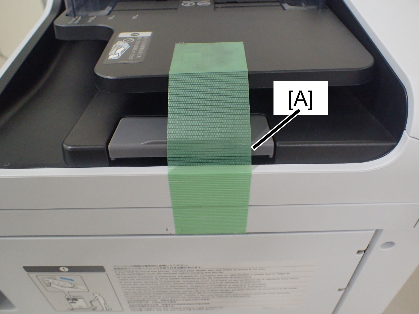 1. Attach protective tape (A) to the contact area between the ADF output tray and ADF document tray.