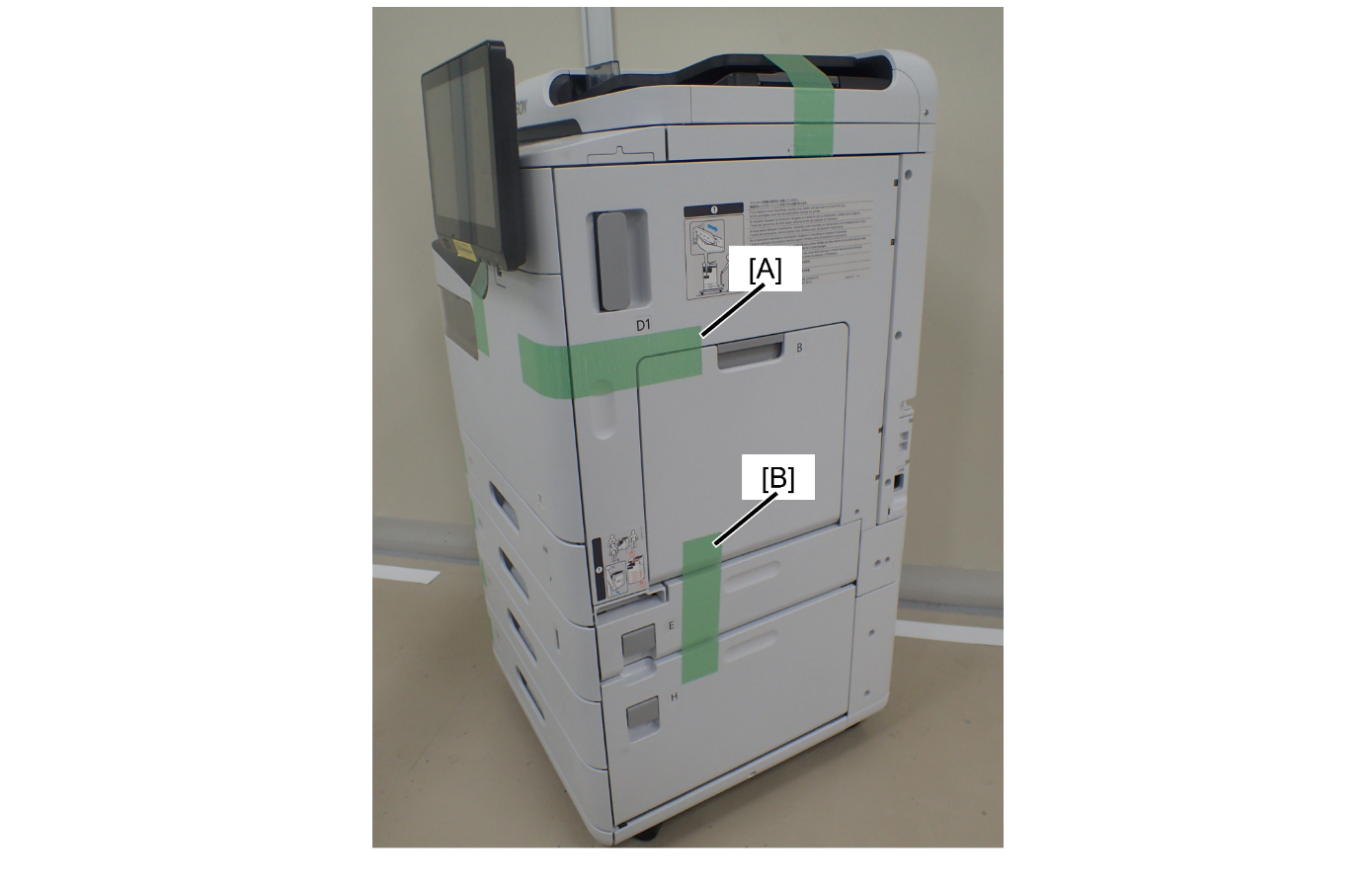 1. Fix the D1 cover and B cover with tape (A).