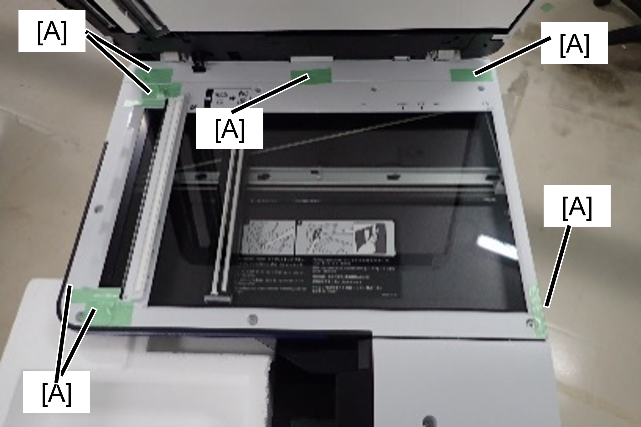 1. Fix the protective tape (A) to the seven contact points on the flatbed of the SCN unit with the ADF unit.